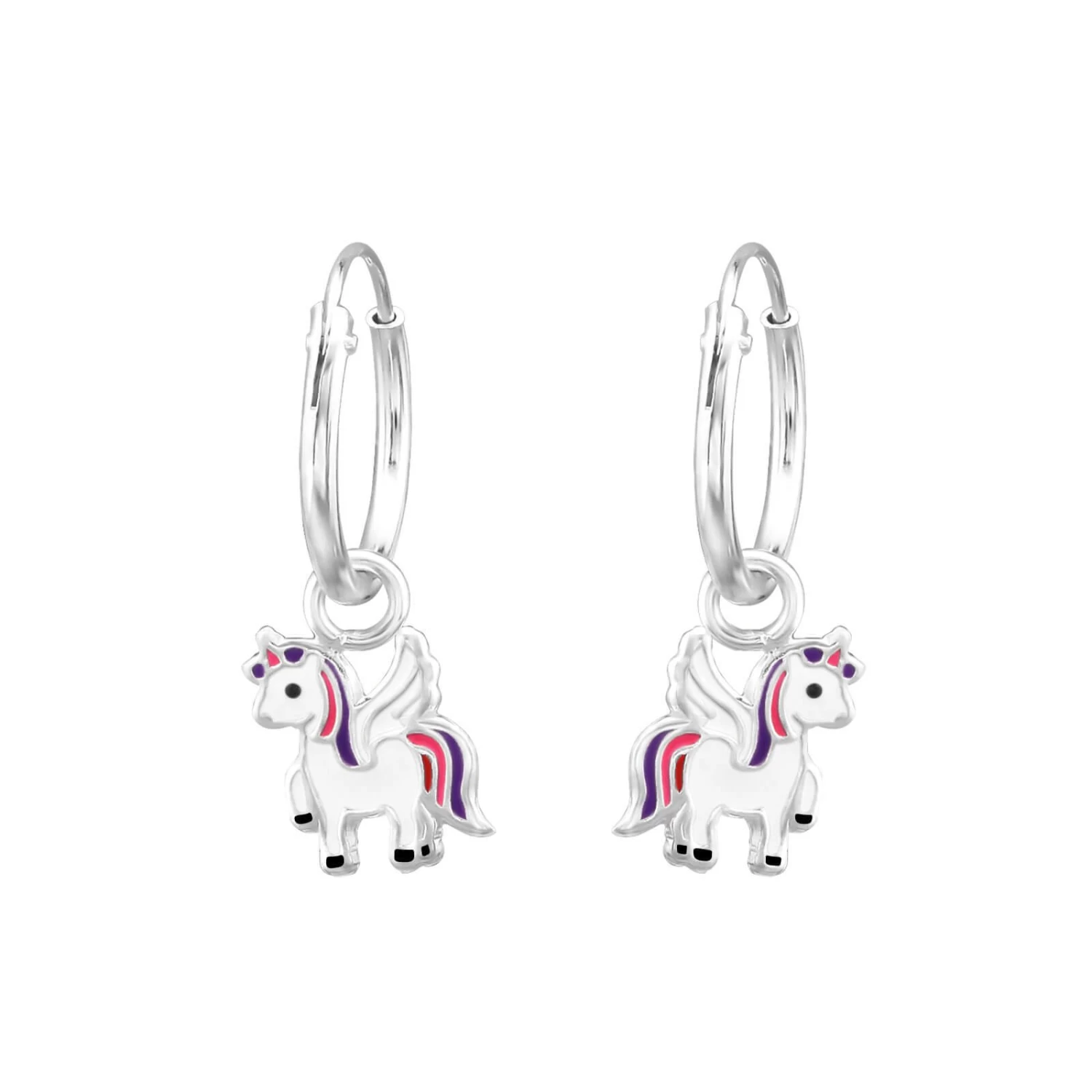 Boucles dâoreille en argent anneau avec une licorne blanche avec la criniĂšre et la queue rose et mauve et les sabots noirs.