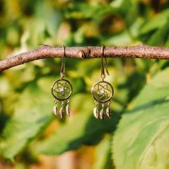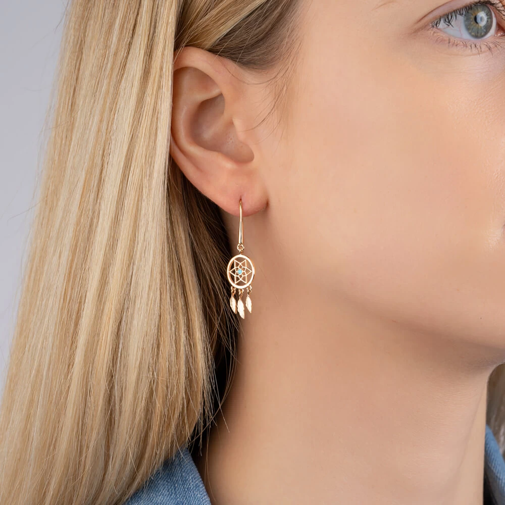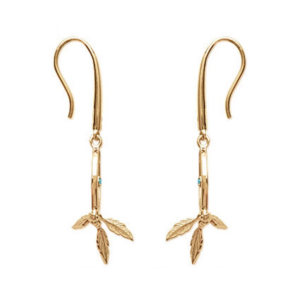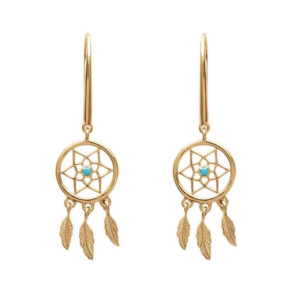 Boucles d’oreilles en plaqué or en forme d’attrape rêve avec un petit strass turquoise au milieu et 3 pendentifs plumes suspendus en dessous.