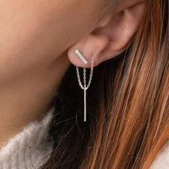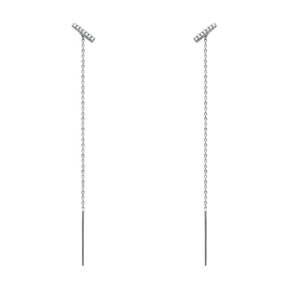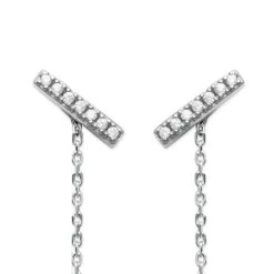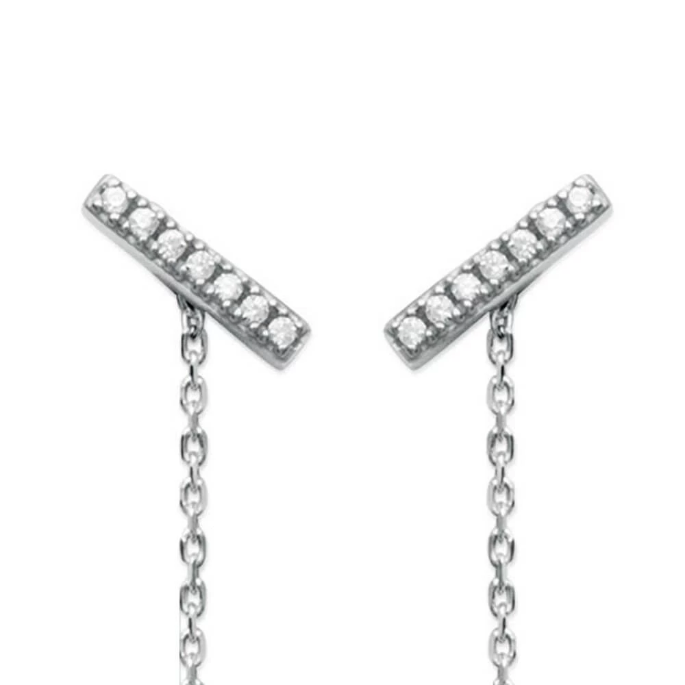 Boucles d’oreilles en argent composées d’une petite barrette sertie de zirconium sur laquelle est accrochée une chaînette en argent finie d’une tige rigide.