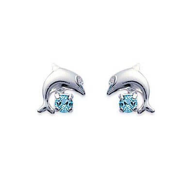 Boucles d’oreilles Enfant en forme de dauphin avec une pierre de couleur bleu.