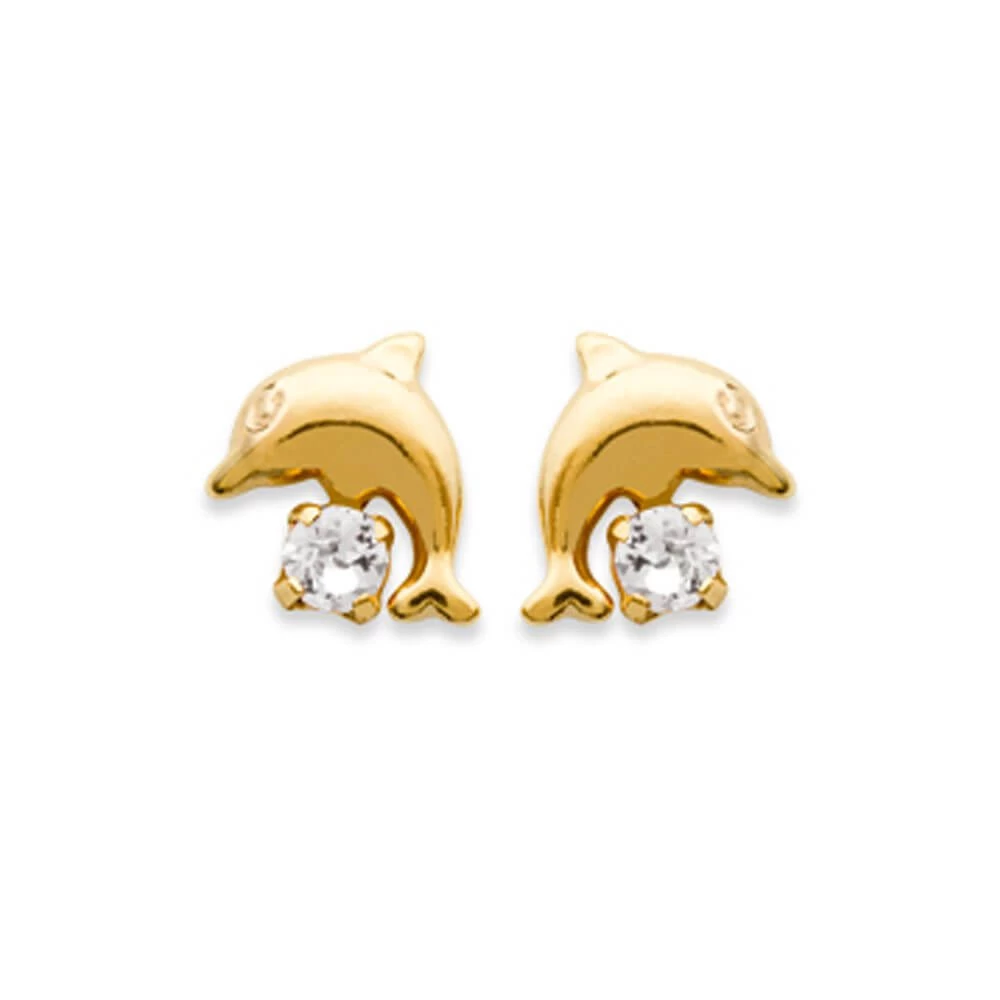Boucles d’oreilles en forme de dauphin plaqué or avec un strass de couleur blanc serti.