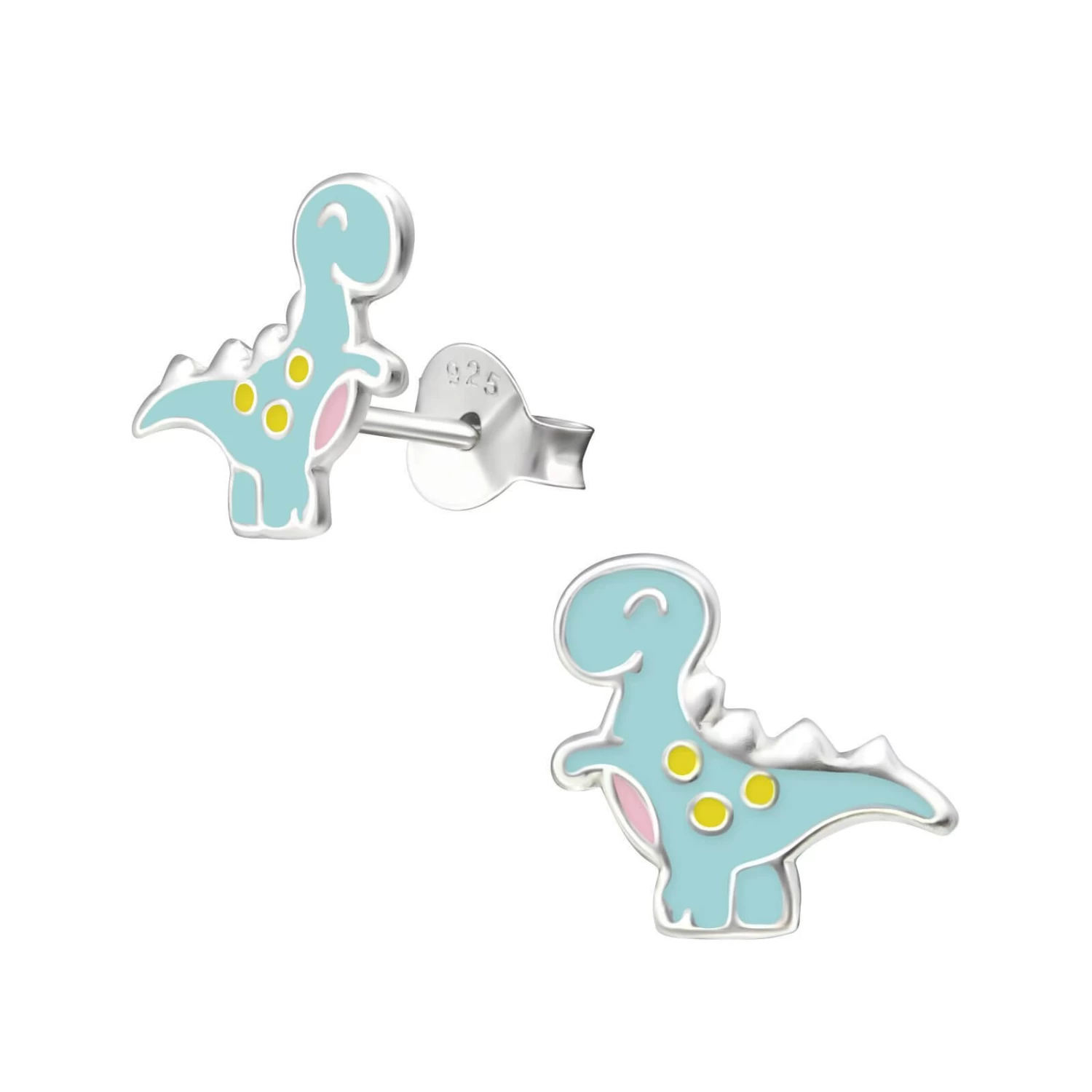 Boucles d’oreilles de forme de petit dinosaure de couleur bleu à poids jaunes et au ventre rose.
