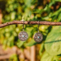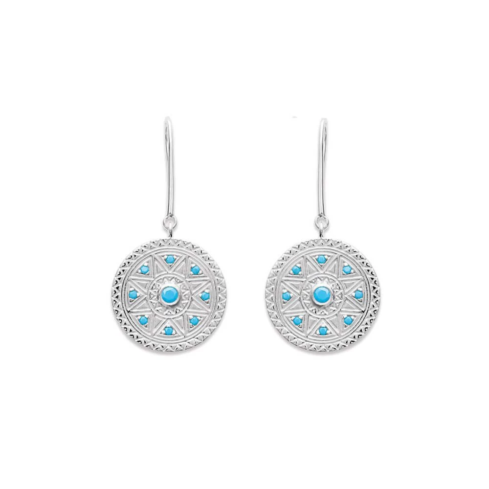 Boucles d’oreille en argent composées d’un rond avec en son centre une pierre turquoise sertie entourée de gravures type aztèques avec d’autres petites pierres couleur turquoise. Elles sont montées sur des tiges rigides en argent.
