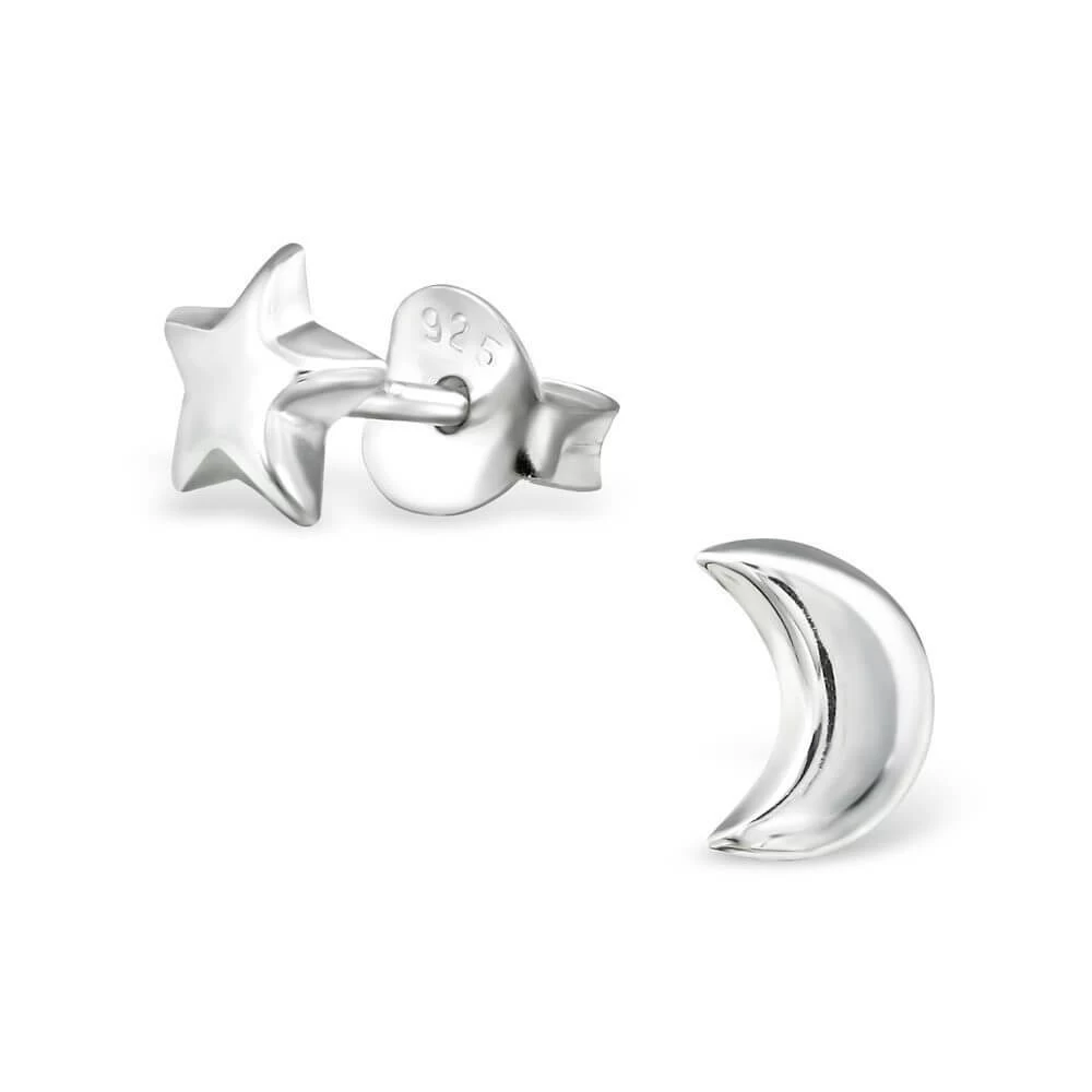 Boucles d’oreilles dépareillées comprenant d’un côté une petite étoile et de l’autre un petit croissant de lune.