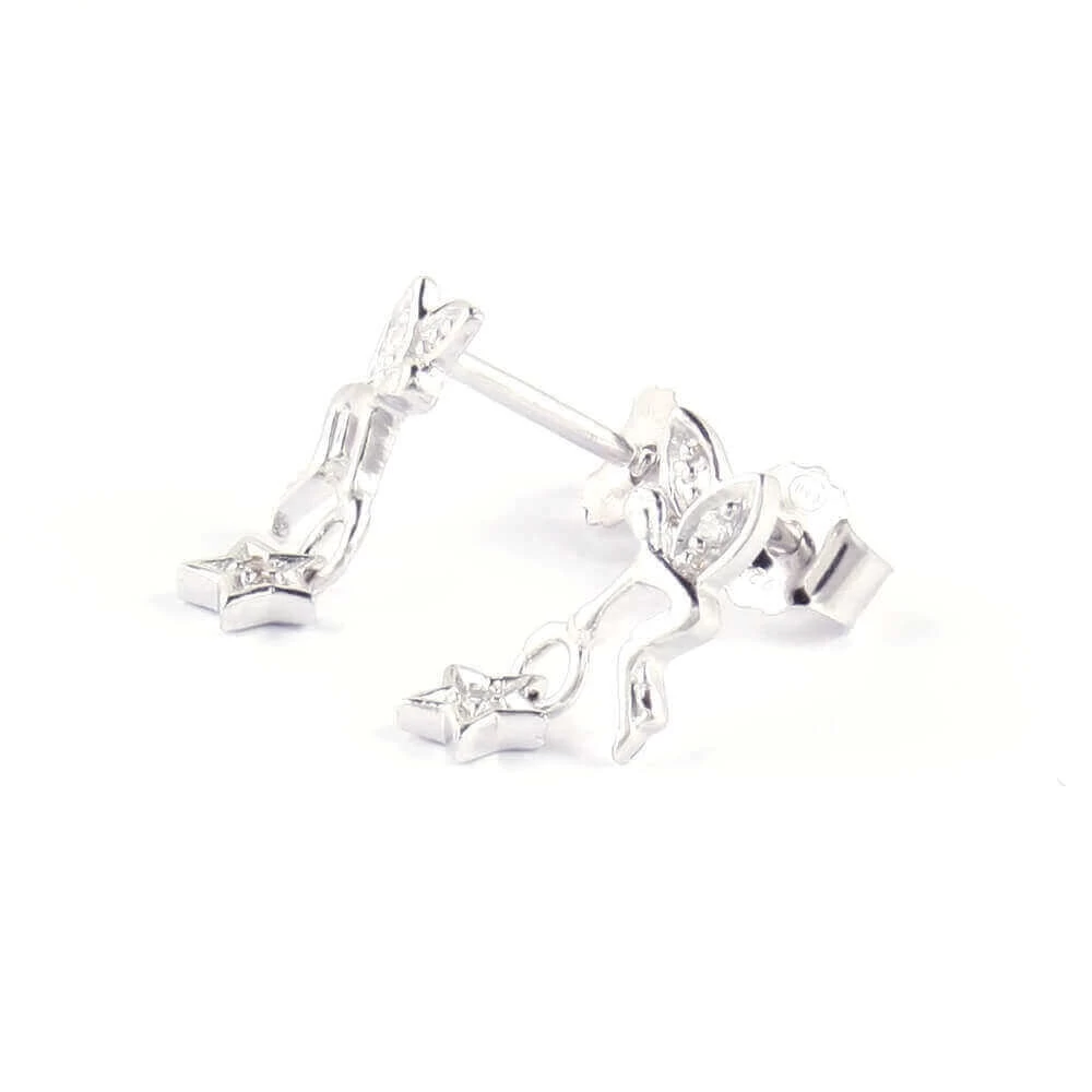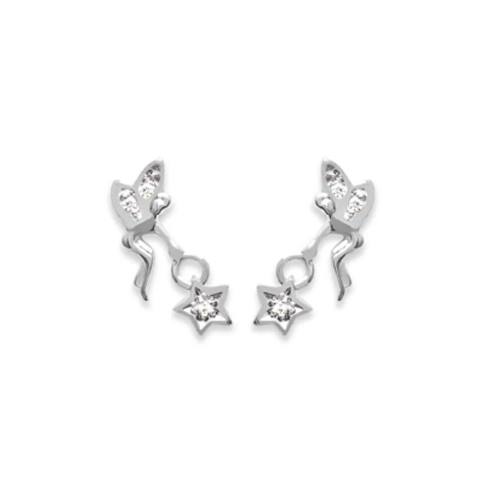 Boucles d’oreilles argent 925 et zirconium représentant une petite fée tenant une étoile.