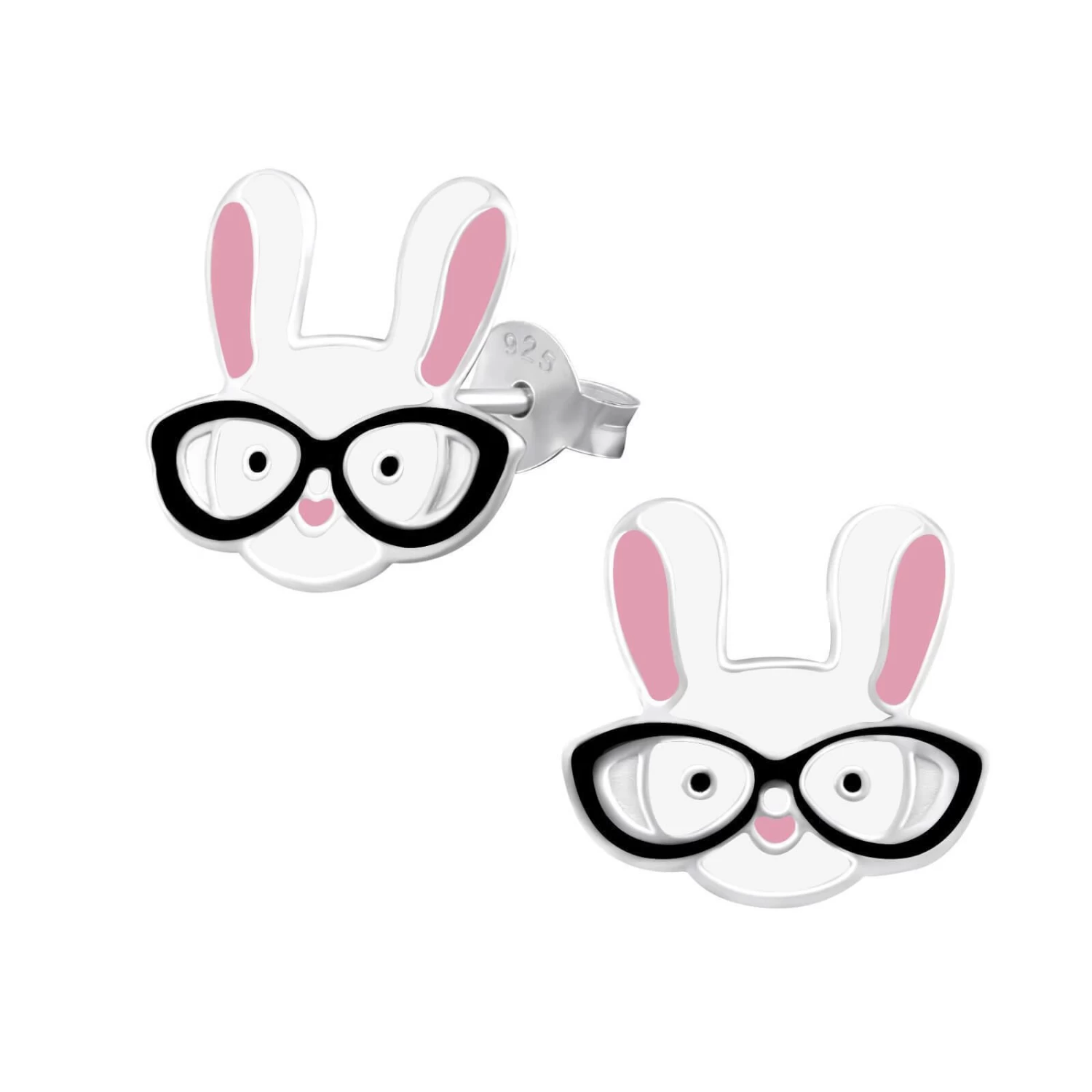 Rigolotes petites boucles d’oreilles en forme de lapin blanc avec une paire de lunettes noires sur le nez.