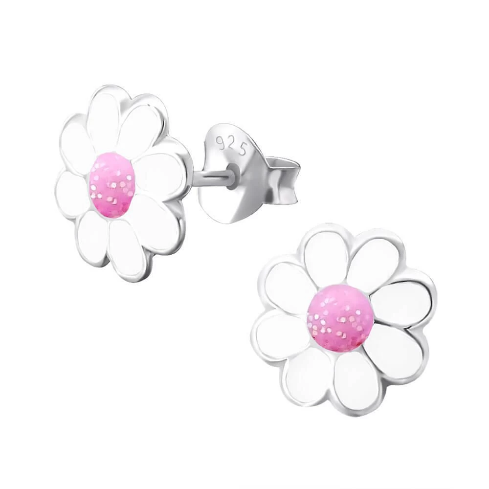 Boucles d’oreilles en forme de marguerite blanche avec un coeur rose pailleté.