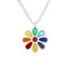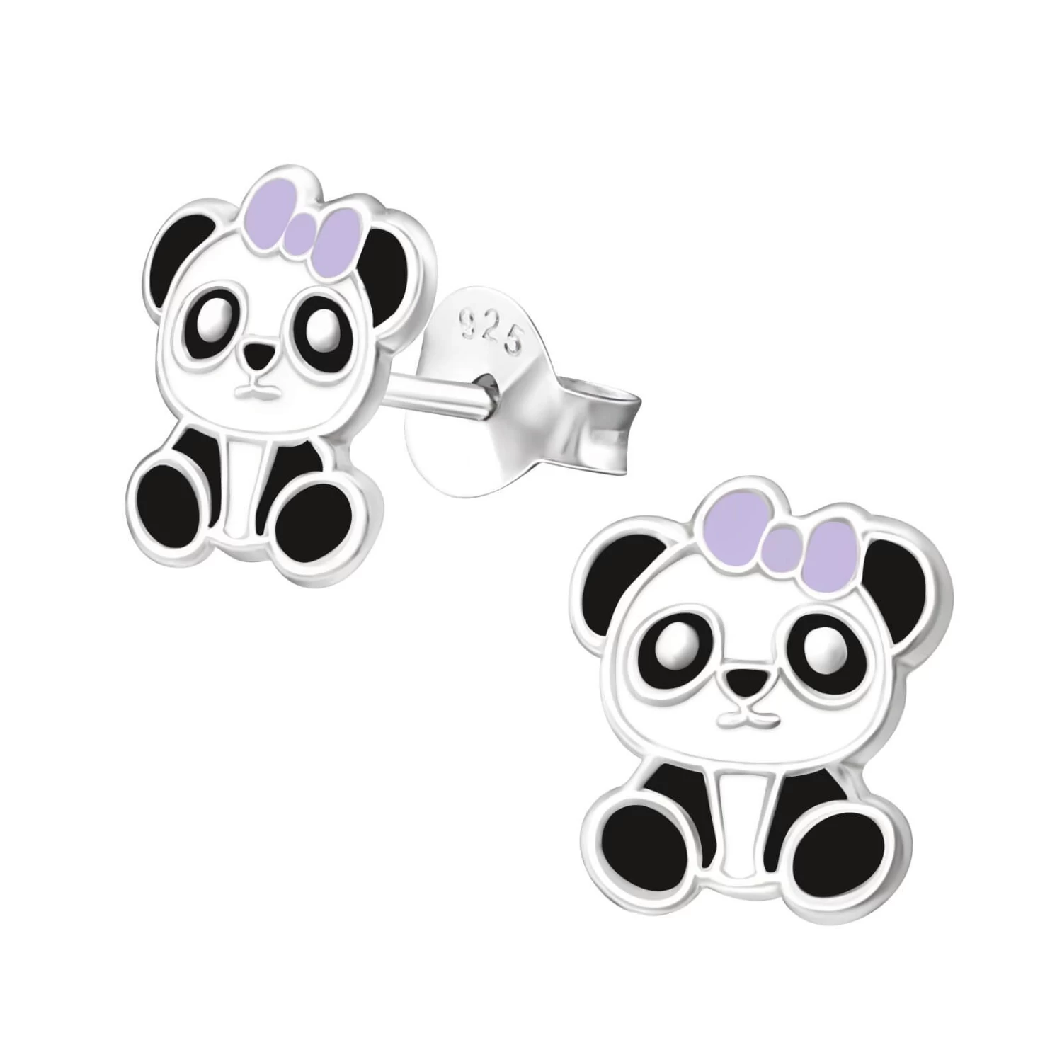 Boucles d’oreilles pour enfant en argent petit panda avec un noeud mauve.