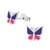 Boucles d’oreilles pour fillette en argent en forme de papillon violet avec des poids blancs.