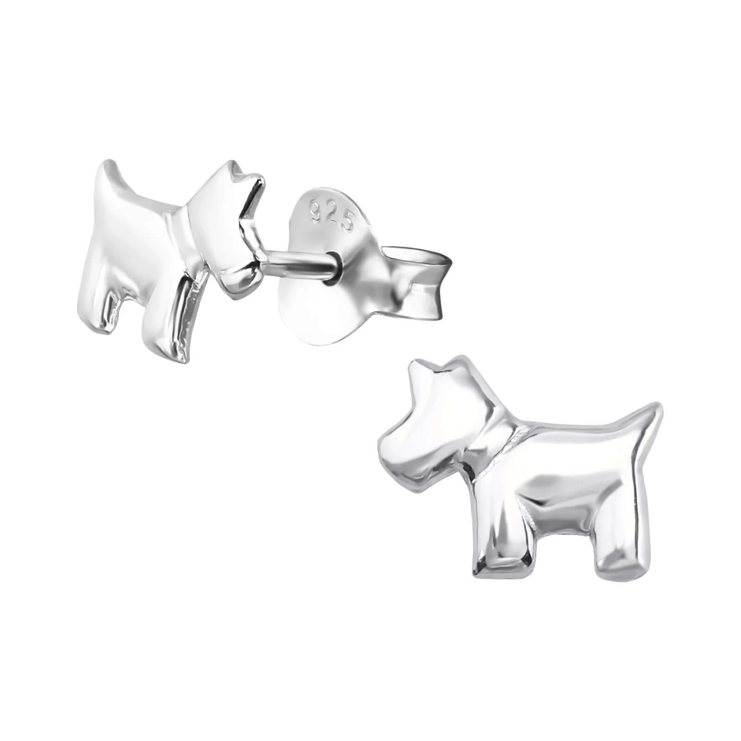 Boucles d’oreilles en forme de petit chien couleur argent.