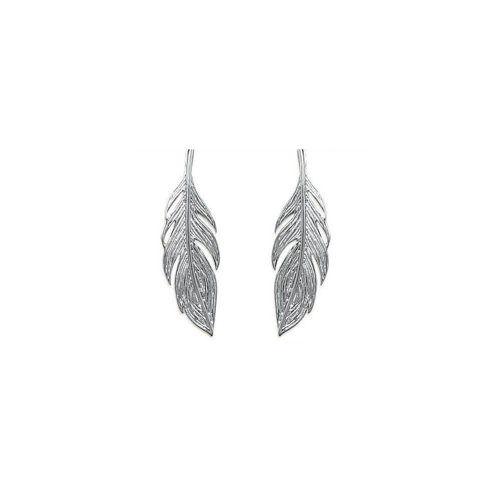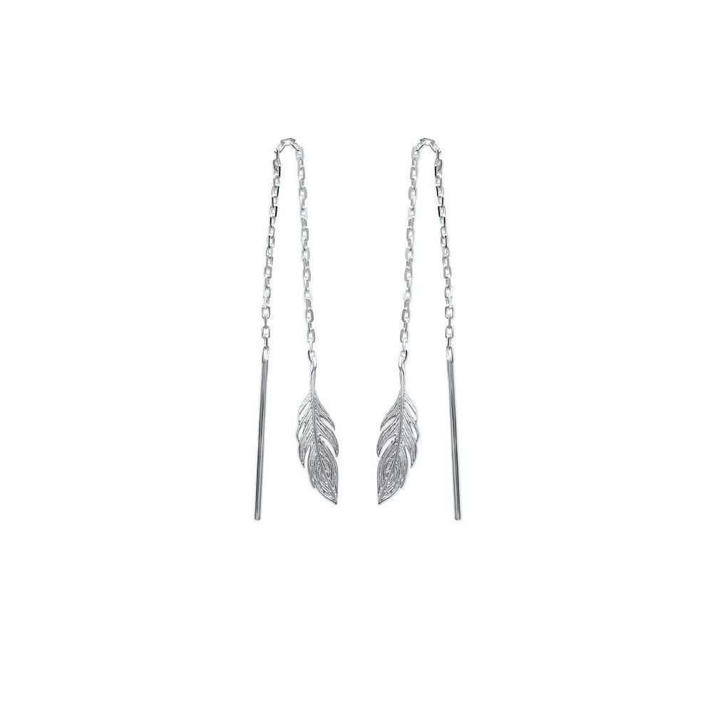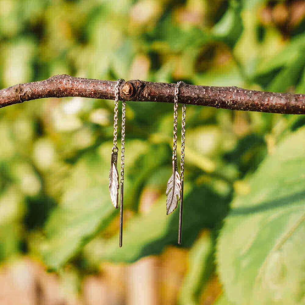Boucles d’oreilles en argent en forme de plume montée sur une chaîne.
