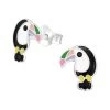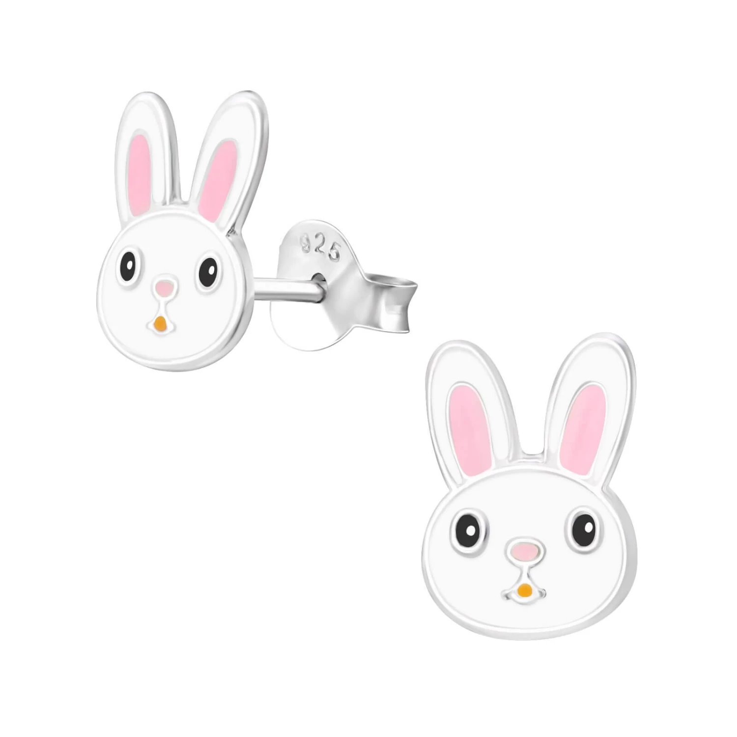Boucles d’oreilles pour enfant en argent qui ont la forme d’une petite tête de lapin blanc avec l’intérieur des oreilles rose.