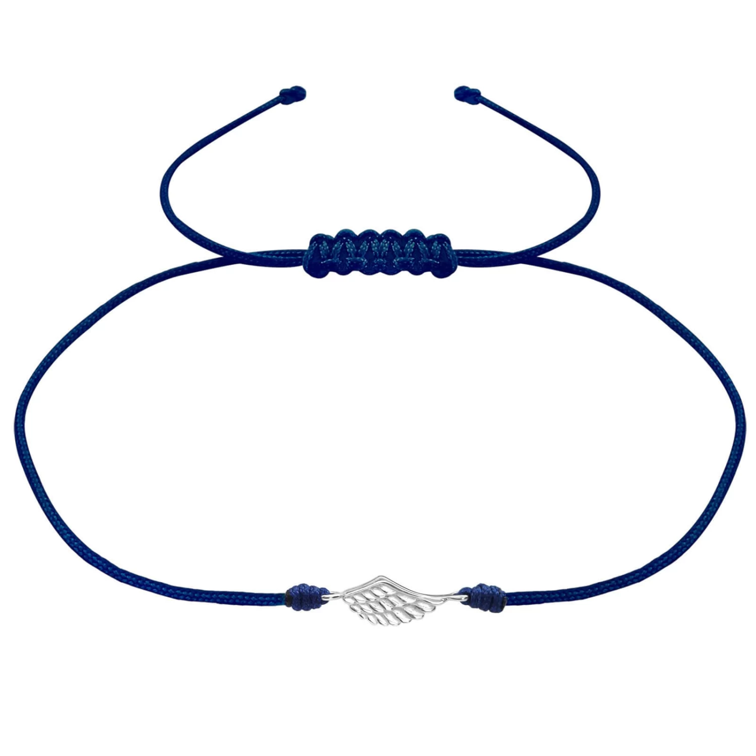 Bracelet composé d’une aile en argent monté sur un fils en coton de couleur bleu foncé
