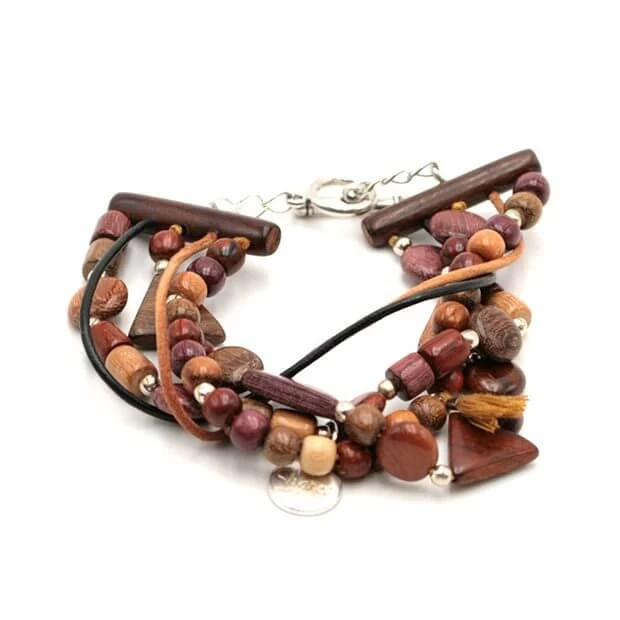 Bracelet manchette brésilien Laura est comprend 3 fils de lin sur lesquels sont montés des rangées de perles en bois rondes multicolores de différente tailles et différentes essences : amarante, mûrier, néflier et palissandre et 2 cordon de cuir caramel et marron.