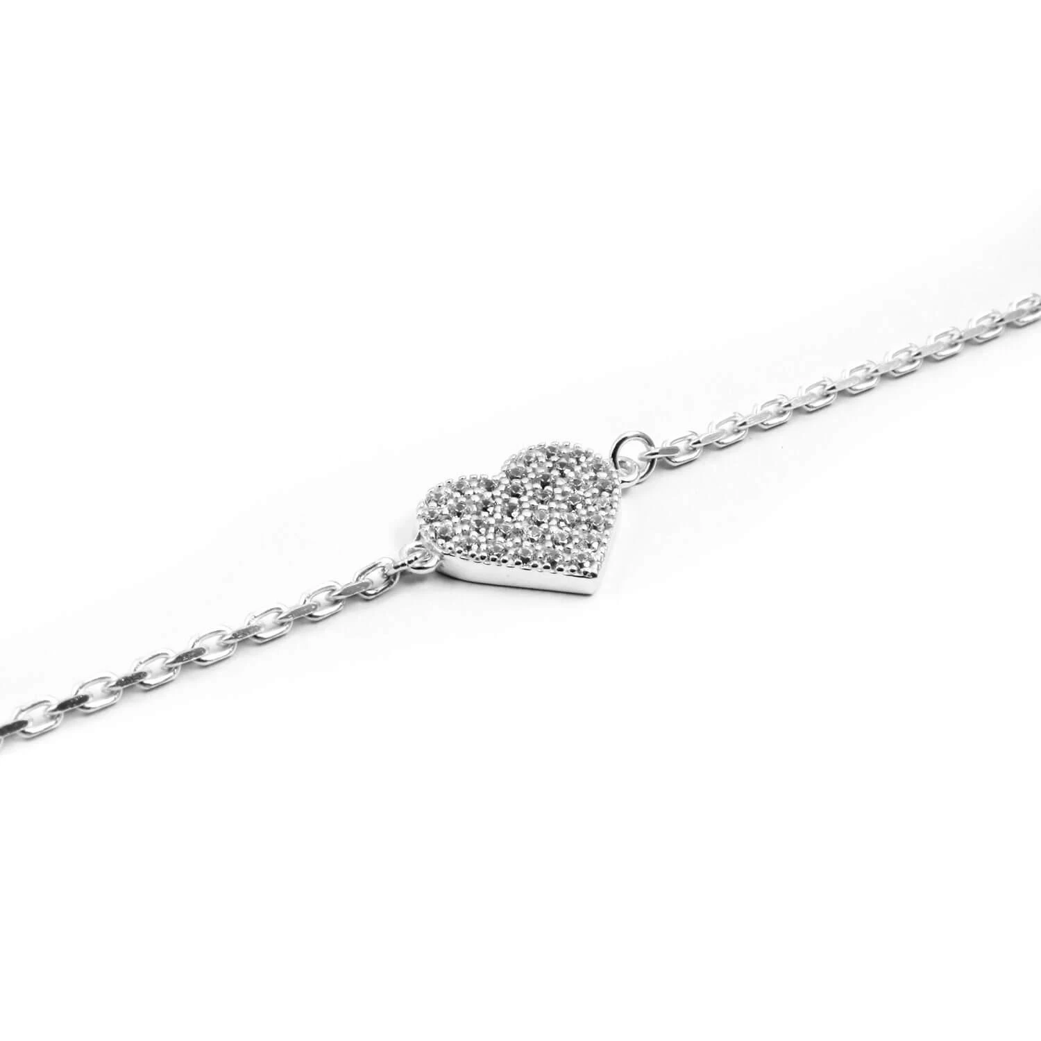 Il est composé d’une chaine en argent comprenant un fermoir et 3 anneaux de réglage. En son centre se trouve un coeur en argent certi de zirconiums blancs.