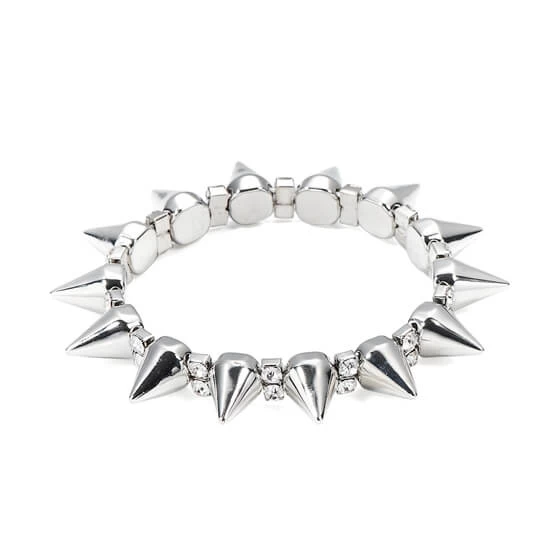 Bracelet composé de cônes argentés et de strass montés sur élastique.