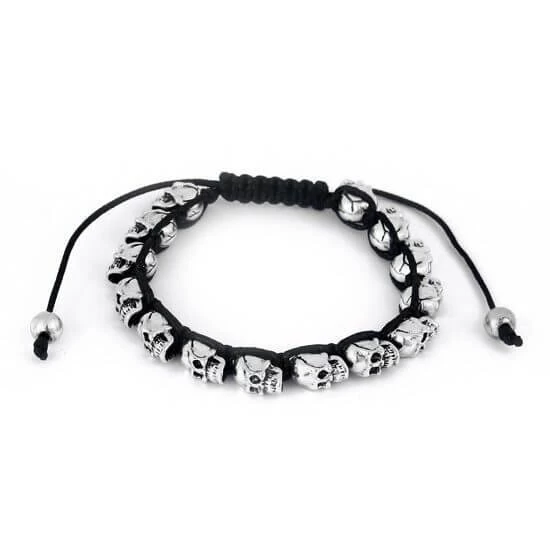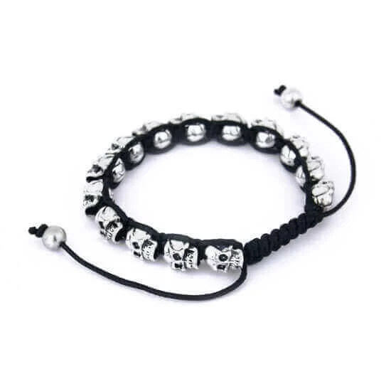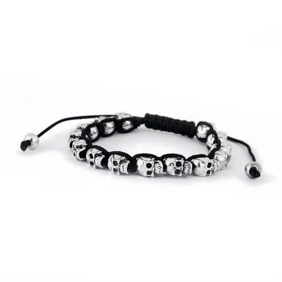 Bracelet crânes en métal montés sur coton noir avec de petites perles en métal.