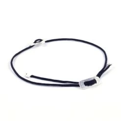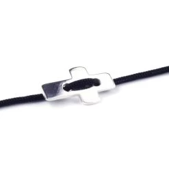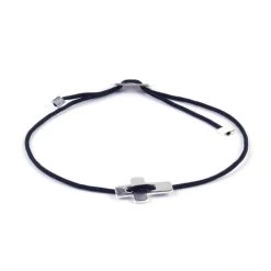 Bracelet composé d’une croix dans laquelle est passée un lien de couleur noir. Une pièce rectangulaire avec 2 encoches ou sont passés les 2 côtés du lien serre de noeud coulissant et à chaque extrémité se trouve un carré en argent.