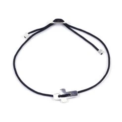 Bracelet composé d’une croix dans laquelle est passée un lien de couleur noir. Une pièce rectangulaire avec 2 encoches ou sont passés les 2 côtés du lien serre de noeud coulissant et à chaque extrémité se trouve un carré en argent.