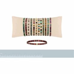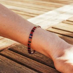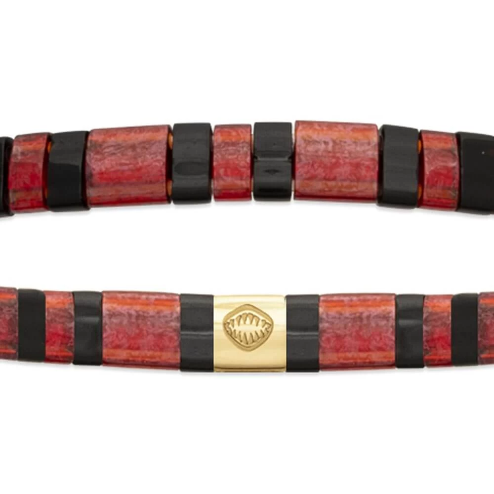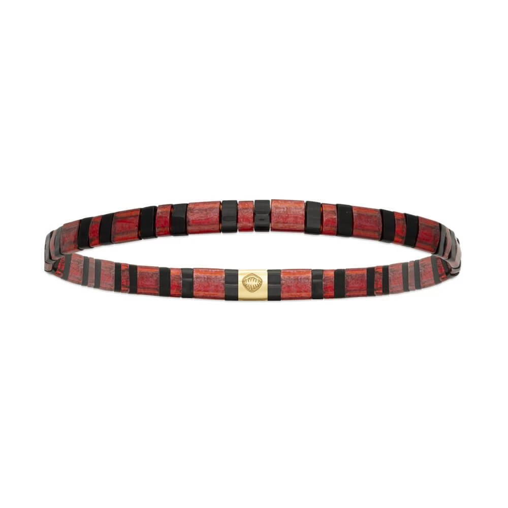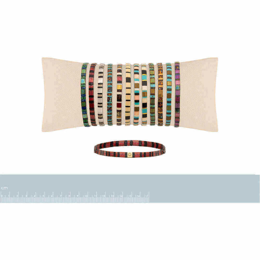 Bracelet composé de perles de verre rectangulaires et plates rouge-rosées et noires avec un fermoir de la meme forme qui est doré et en acier.