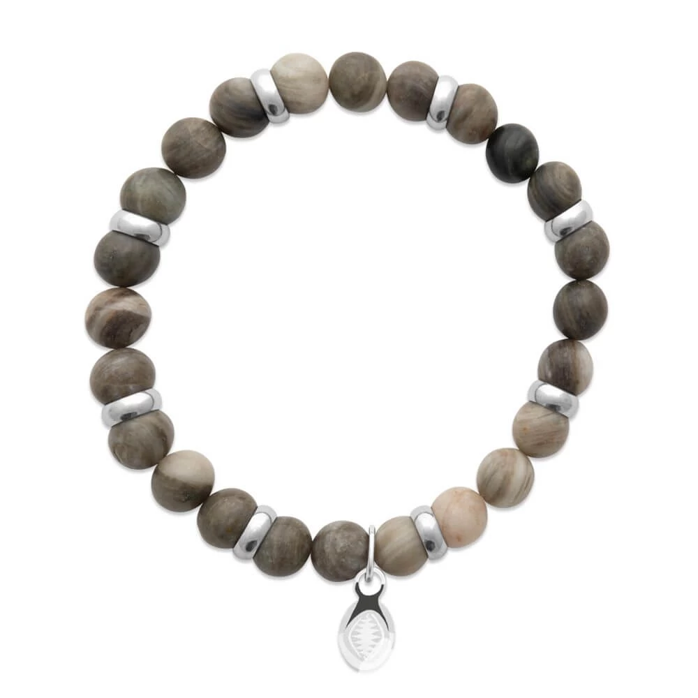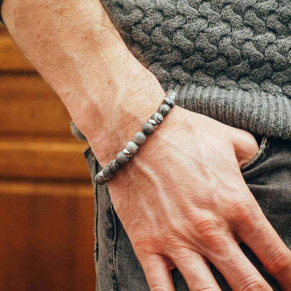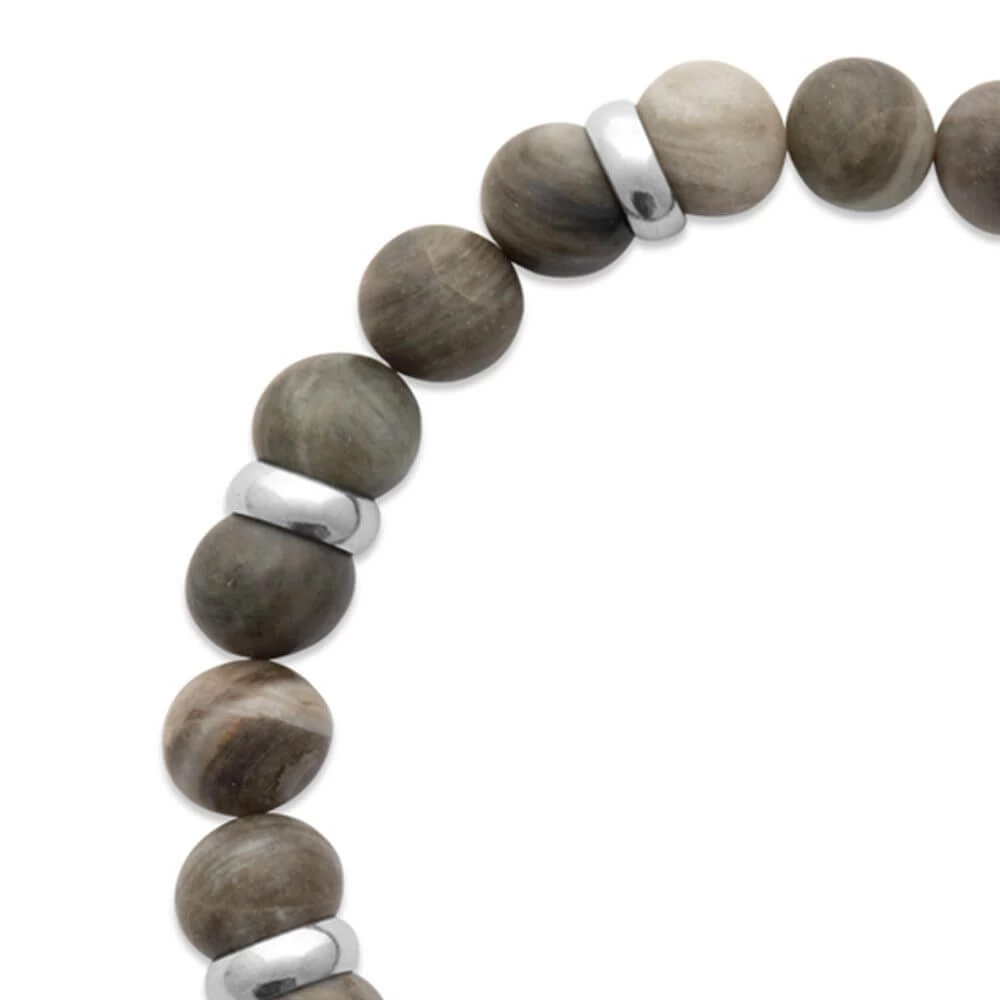 Bracelet pour homme composé de perle en Jaspe Kaki et de petites perles plates en acier.