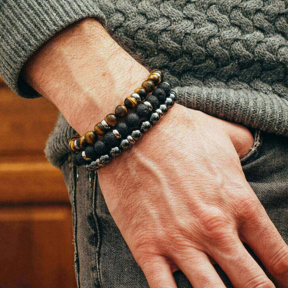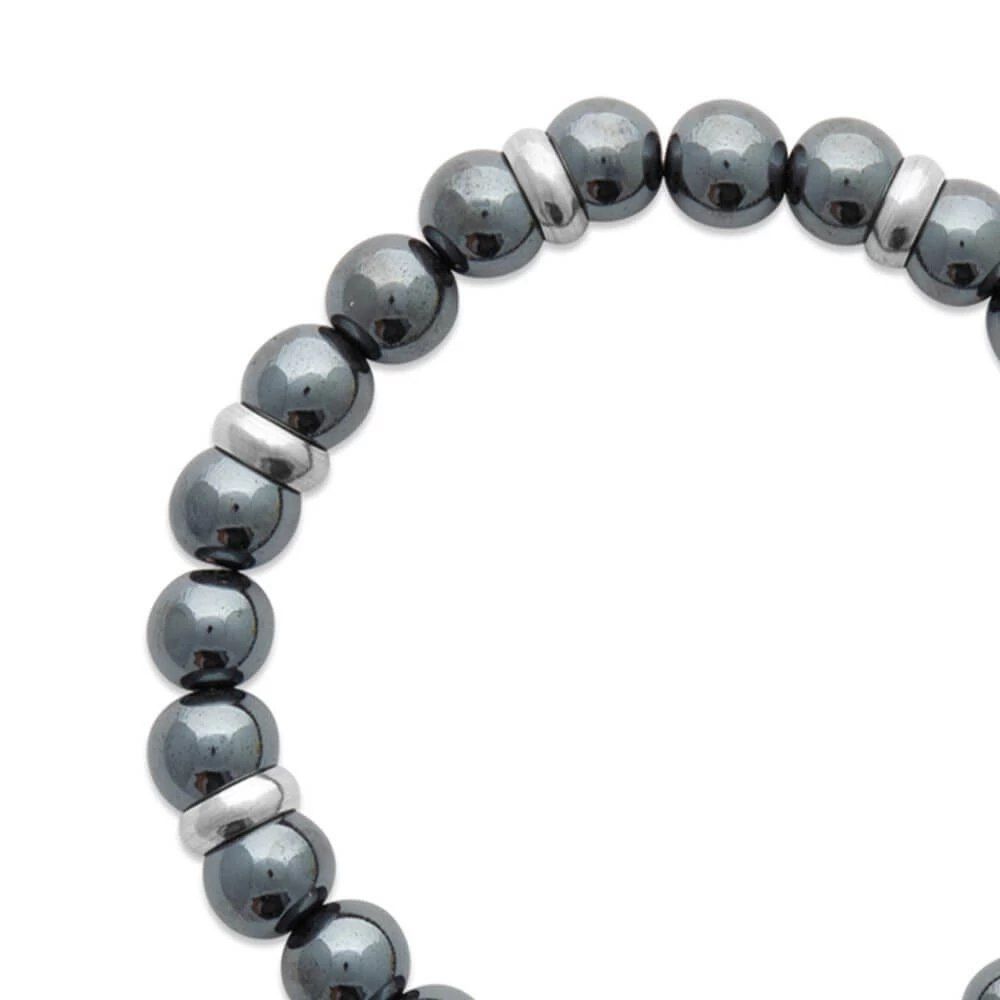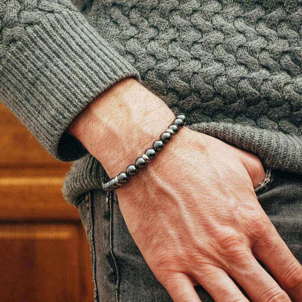 Bracelet pour homme composé de perles en Hématite et de petites perles plates en acier.