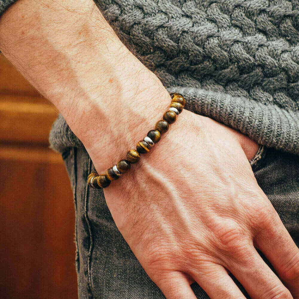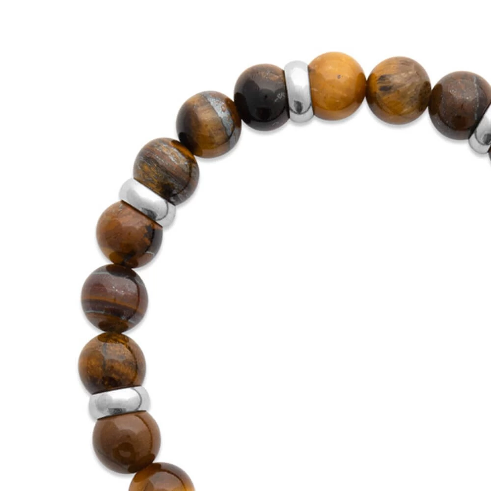 Bracelet pour homme composé de perle en Oeil de Tigre et de petites perles plates en acier.