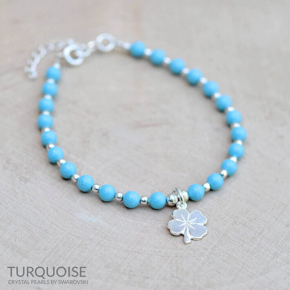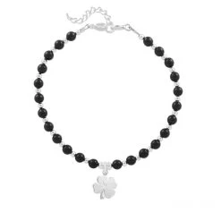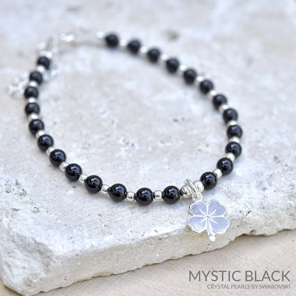 Bracelet en Argent 925 orné d’authentiques perles noires de cristal nacrées avec un trèfle à 4 feuilles en Argent.
