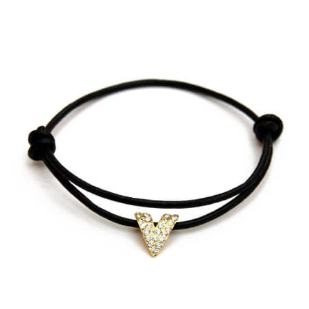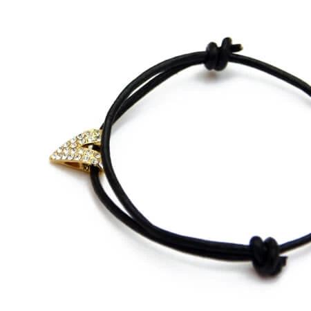 Bracelet composé d’un V doré incrusté de strass monté sur un lien en cuir.