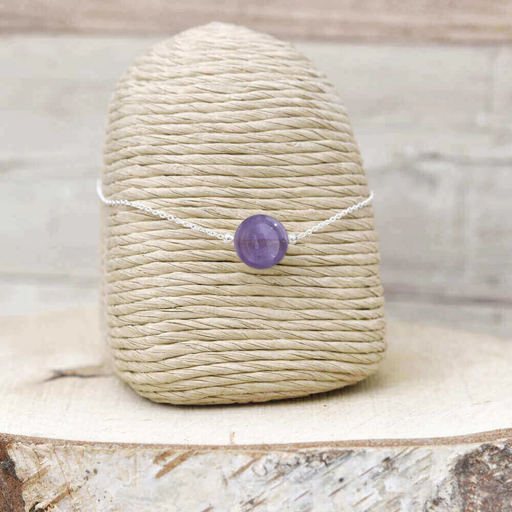 Ce collier ras de cou est composé d’une perle en améthyste naturelle avec 1 petite perle en argent de part et d’autre, le tout monté sur une chaîne en argent.