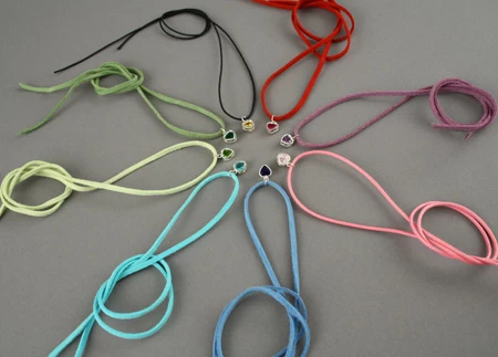 Collier comprenant un pendentif « petit cœur » en argent avec verre taillé et facetté incrusté monté sur un anneau et un lien en coton ou en peau.