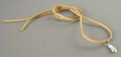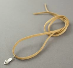Présenté ici porté avec un lien de coton ciré rose et posé avec un lien de peau beige.