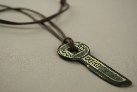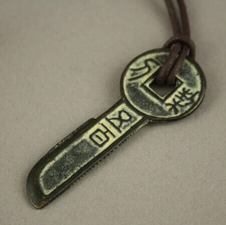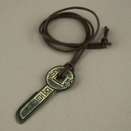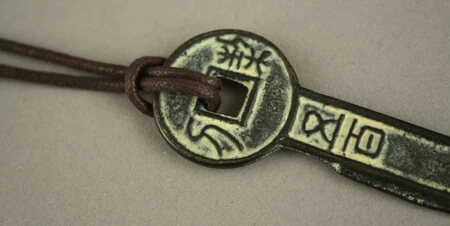 Reproduction de monnaie ancienne chinoise au bout d’un lien en coton ciré.