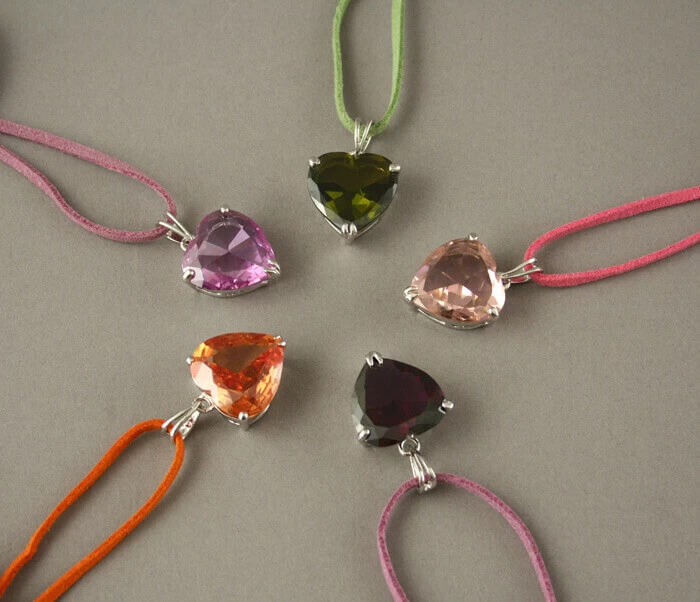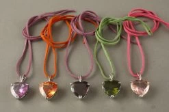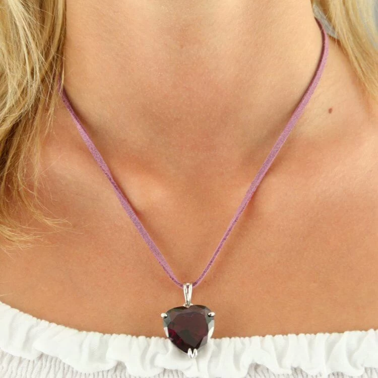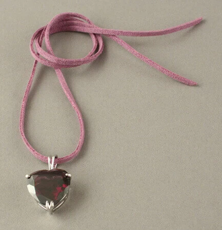 Cœur en verre teinté mauve monté en pendentif sur un lien en peau ou coton.