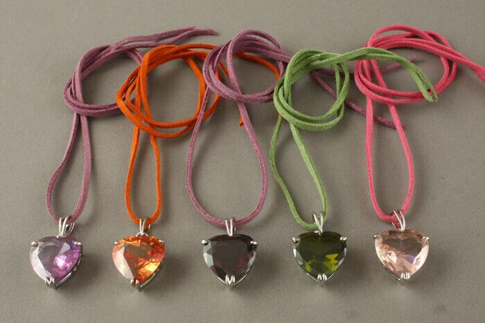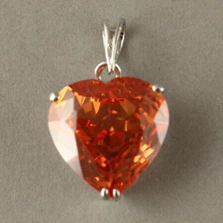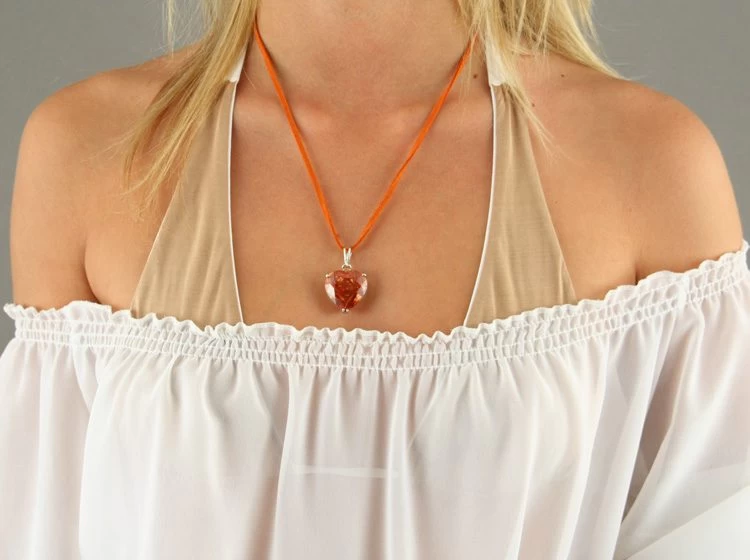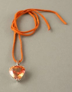Cœur en verre teinté orange monté en pendentif sur un lien en peau ou coton.