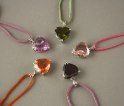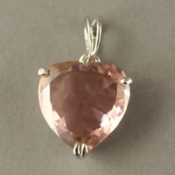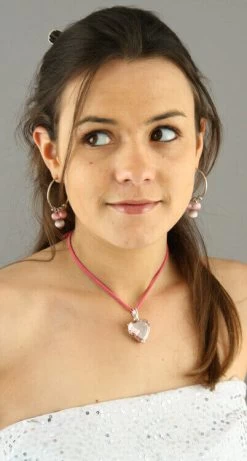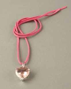 Cœur en verre teinté rose monté en pendentif sur un lien en peau ou coton.