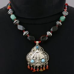 Collier Ethnique en métal argenté avec un pendentif comprenant 2 décorations en résine bleu turquoise et 1 décoration en résine turquoise froncé. Accroché au pendentif, vous trouverez 7 perles.