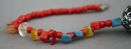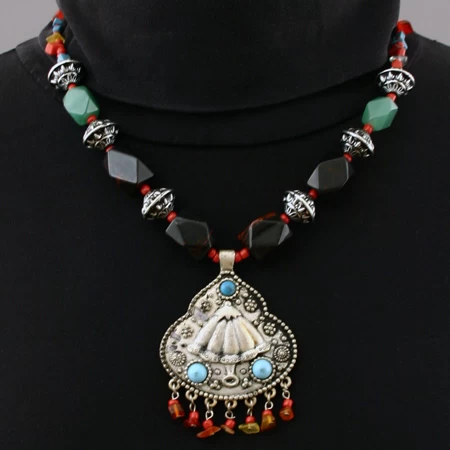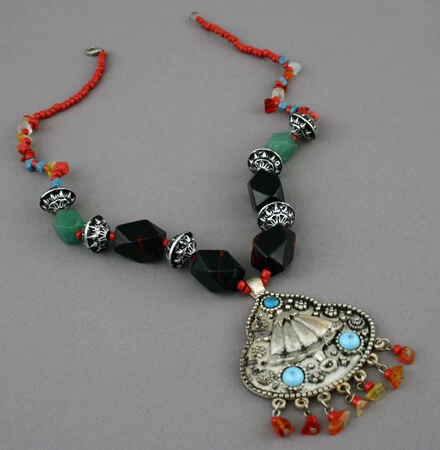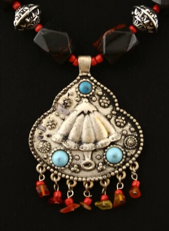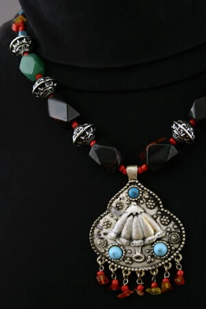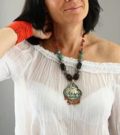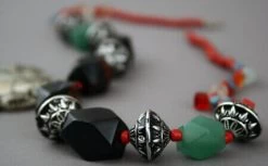 Le collier est composé de perles multicolores et pierres véritables : 4 noires nervées de d’ambre et 2 vertes (Cambodge).