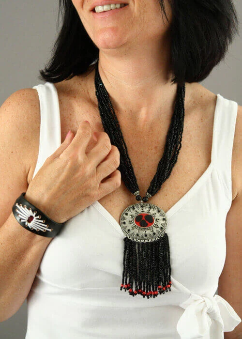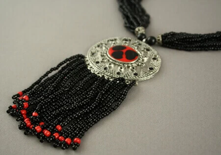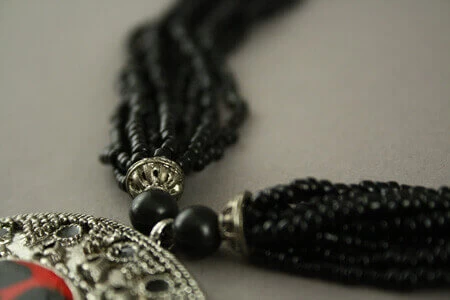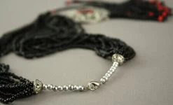 12 rangs de perles noires comprenant 1 perle rouge accrochés au pendentif.