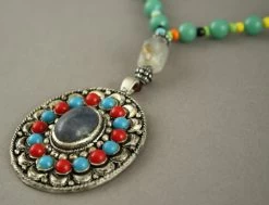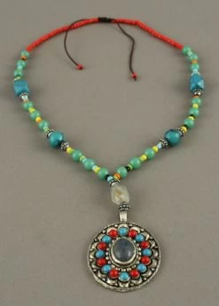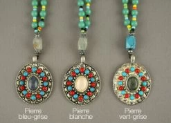 Collier Ethnique en métal argenté avec un pendentif comprenant des décorations bleues et rouges et au milieu une pierre ovale.