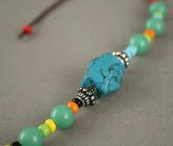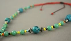 Le collier est composé de perles de différentes tailles et différents matériaux : pierres et métal (Cambodge).