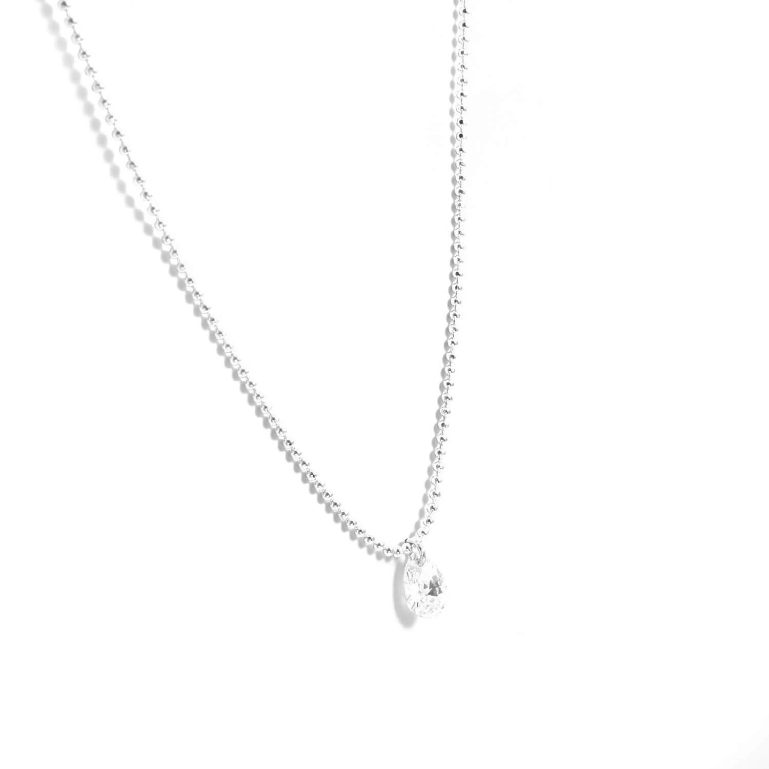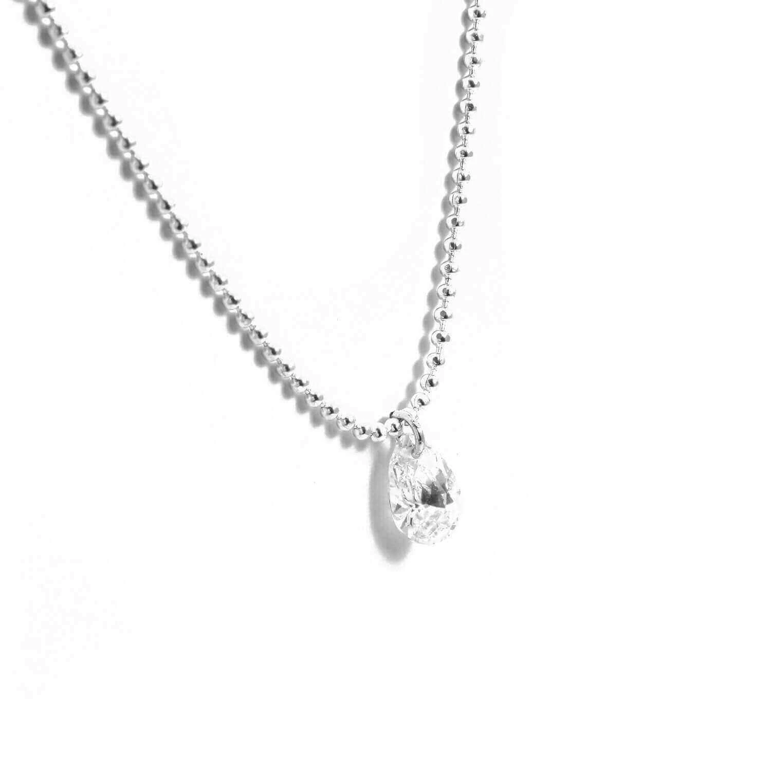 Collier composé d’une fine chaîne boule argentée avec un zircon en forme de goutte taillé comme un diamant et non sertie.
