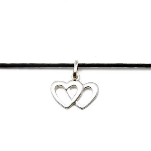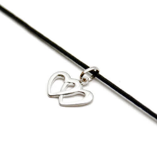 Collier comprenant un pendentif coeur entrelacé en argent sur un anneau et un lien en coton ou en peau.