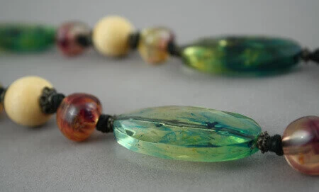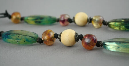 Long collier composé de différentes perles dont 6 grandes translucides de 5 x 3 cm.