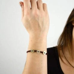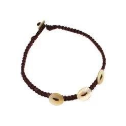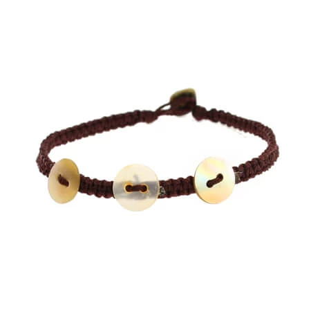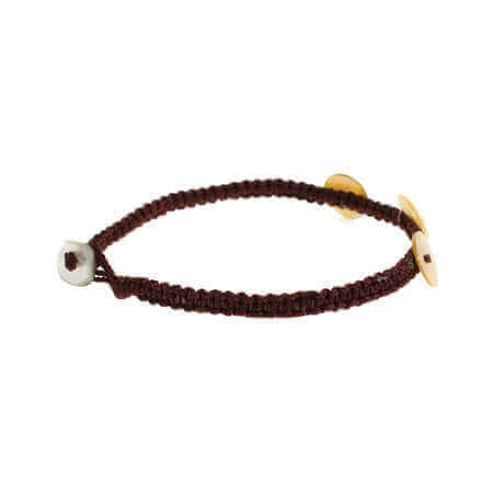 Petit bracelet en coton marron foncé avec 3 petits boutons et bouton fermoir en nacre (couleur naturelle).